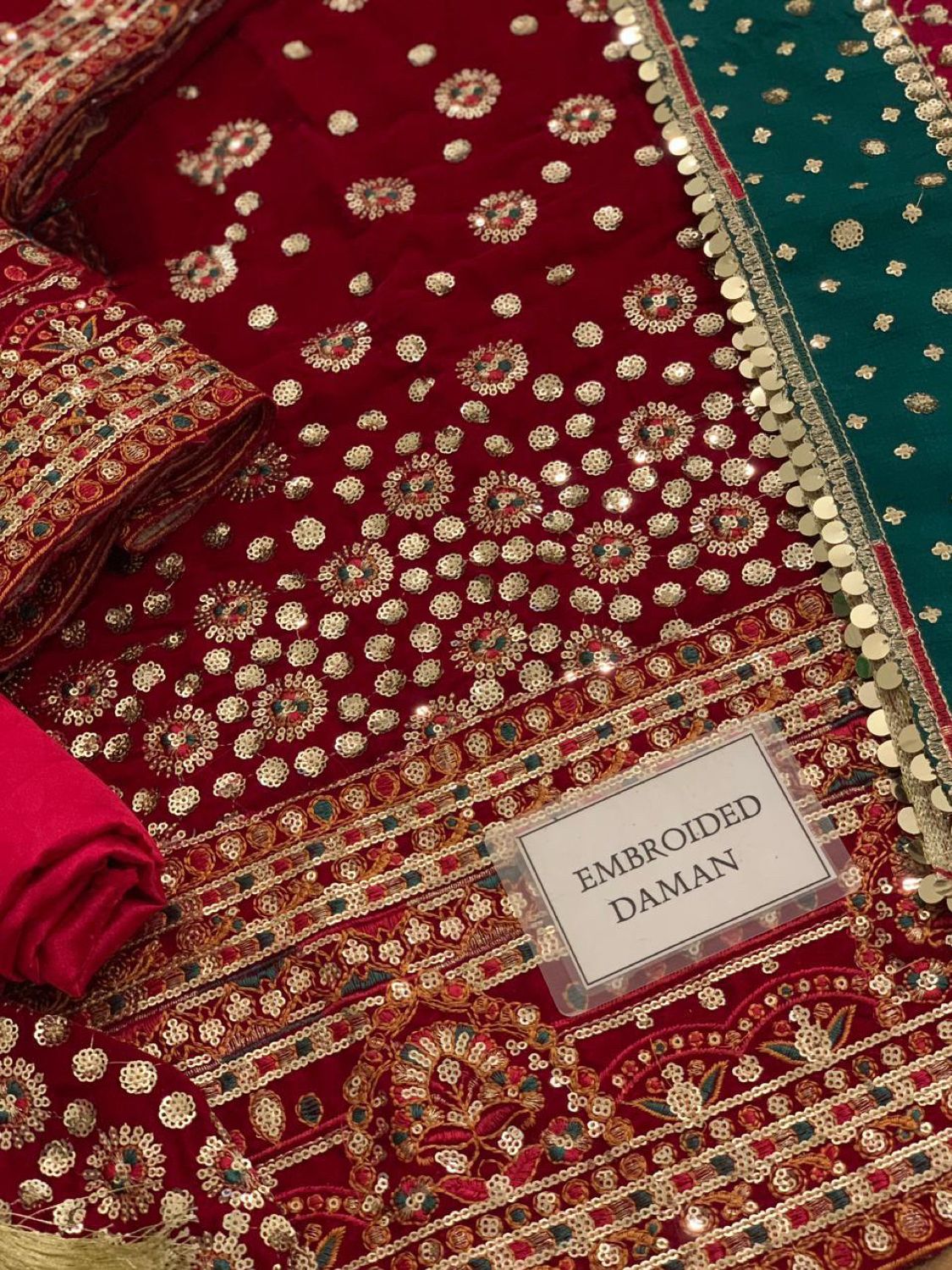 velvet plain back with heavy embroidered spangle work back daman boarder