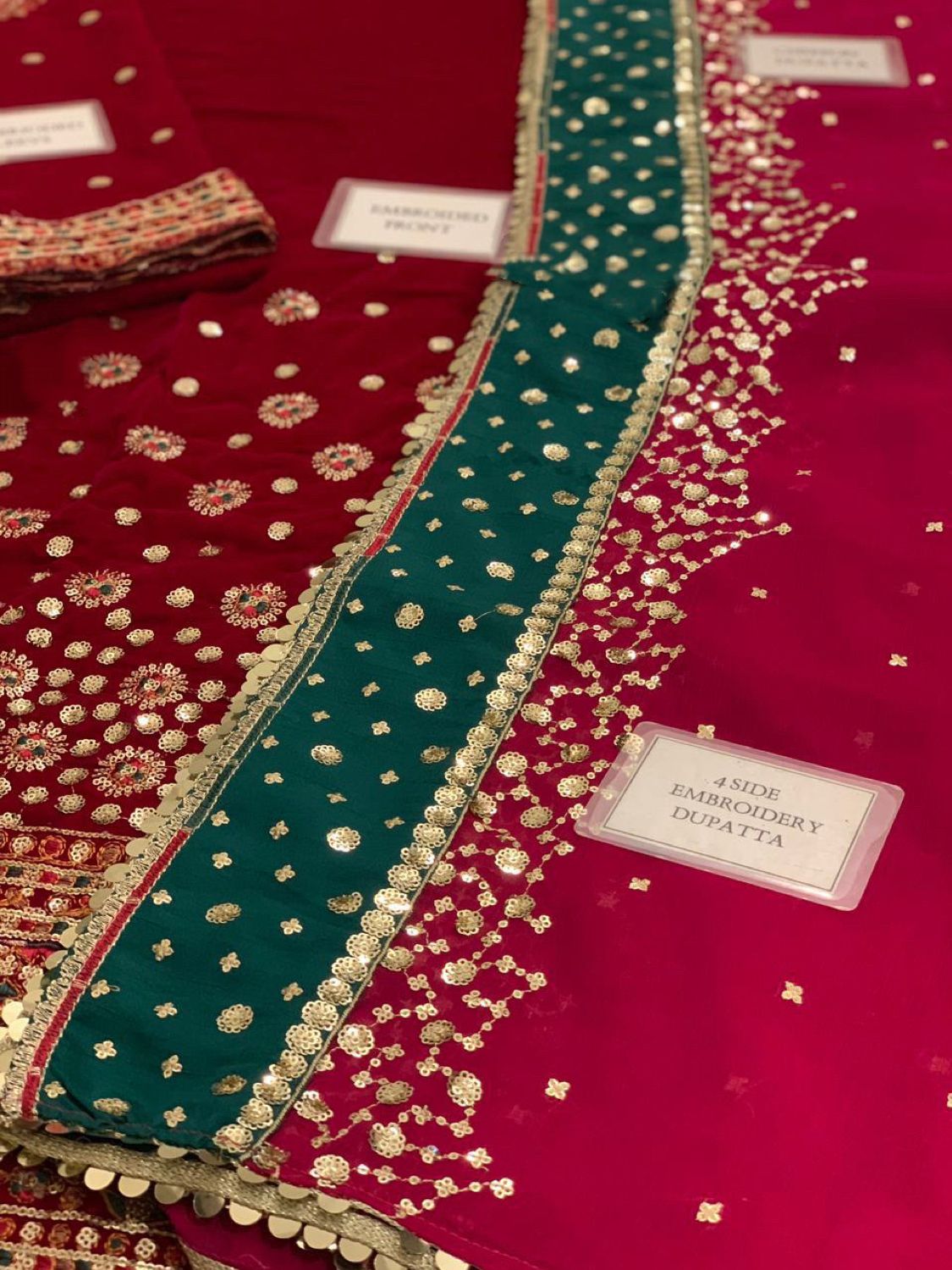 chiffon fully embroidered spangle work dupatta with 2 side raw silk embroidered border attach with 4 side fancy lace.