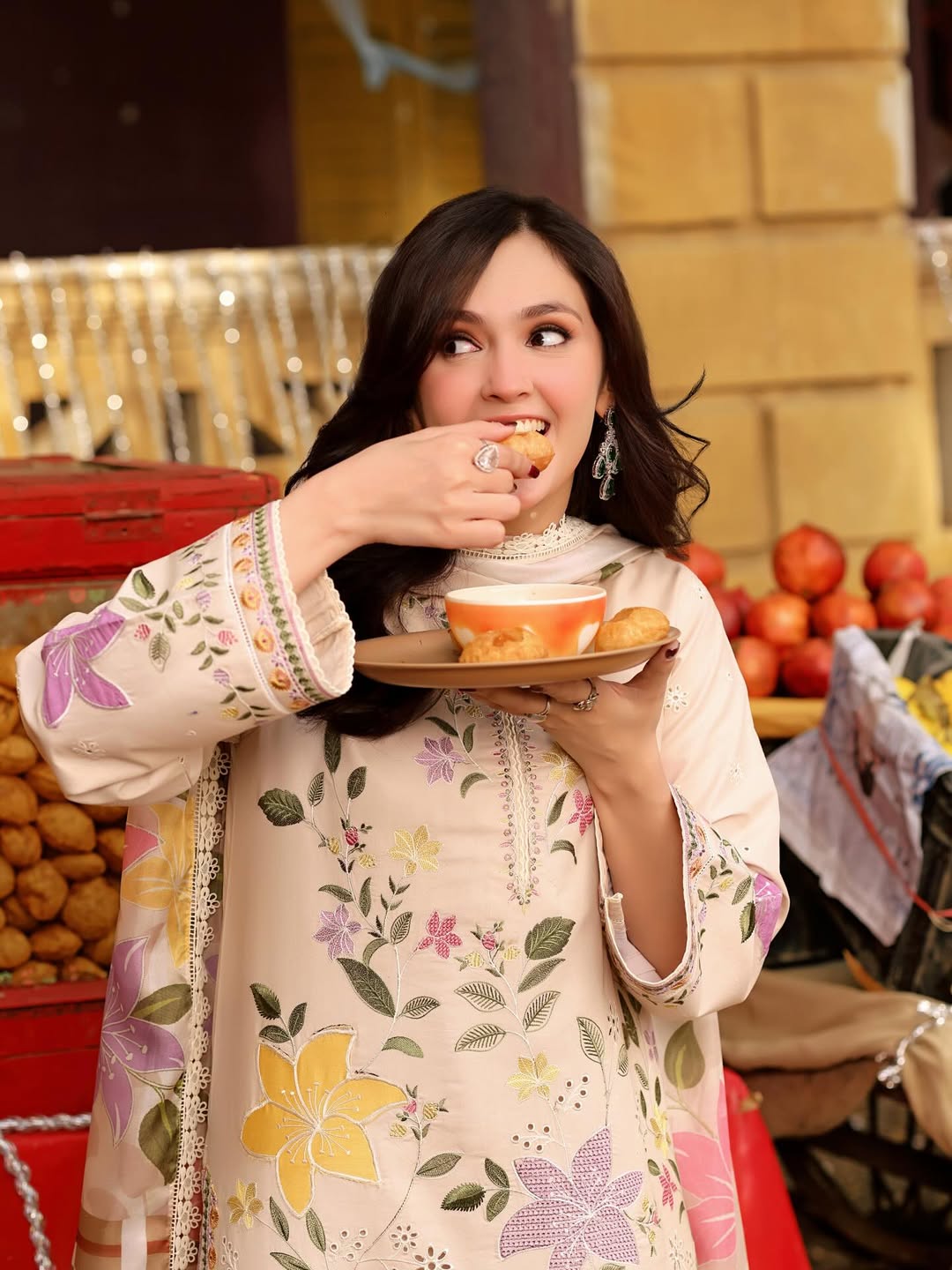 Elegant three-piece lawn suit featuring a shirt with embroidered Chikankari and applique work on the front, along with embroidered chock and daman borders. The sleeves are also embroidered with matching borders, paired with a trouser featuring an embroidered border. Completed with a digital printed dupatta with four-sided embroidered borders for a festive and graceful look.