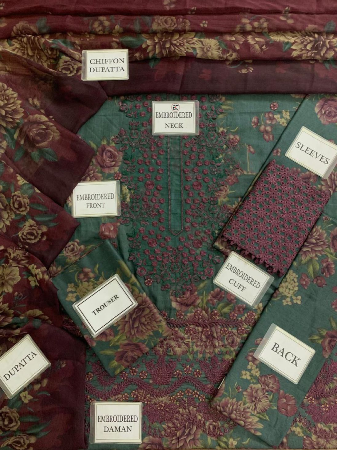 Front: Premium printed pure lawn with intricate heavy embroidery, featuring an exquisitely detailed neckline border