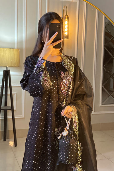 The neckline sleeves and front panel are beautifully enhanced with intricate rhinestone flowing wave patterns.paired with the outfit with a sheer black dupatta lavishly rhinestone border with matching wavy floral detailing finished with refined look.