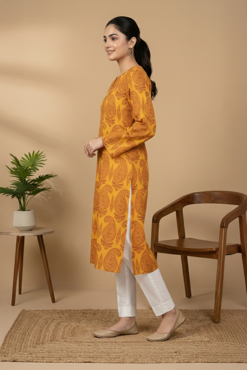 Bright and effortlessly elegant, this printed shirt is crafted from pure cotton lawn fabric featuring a classic mustard base adorned with intricate paisley motifs. Designed with a straight silhouette and comfortable relaxed fit, it offers both style and ease for everyday wear. The soft breathable fabric, round neckline, and full sleeves make it a perfect choice for casual outings and summer styling.